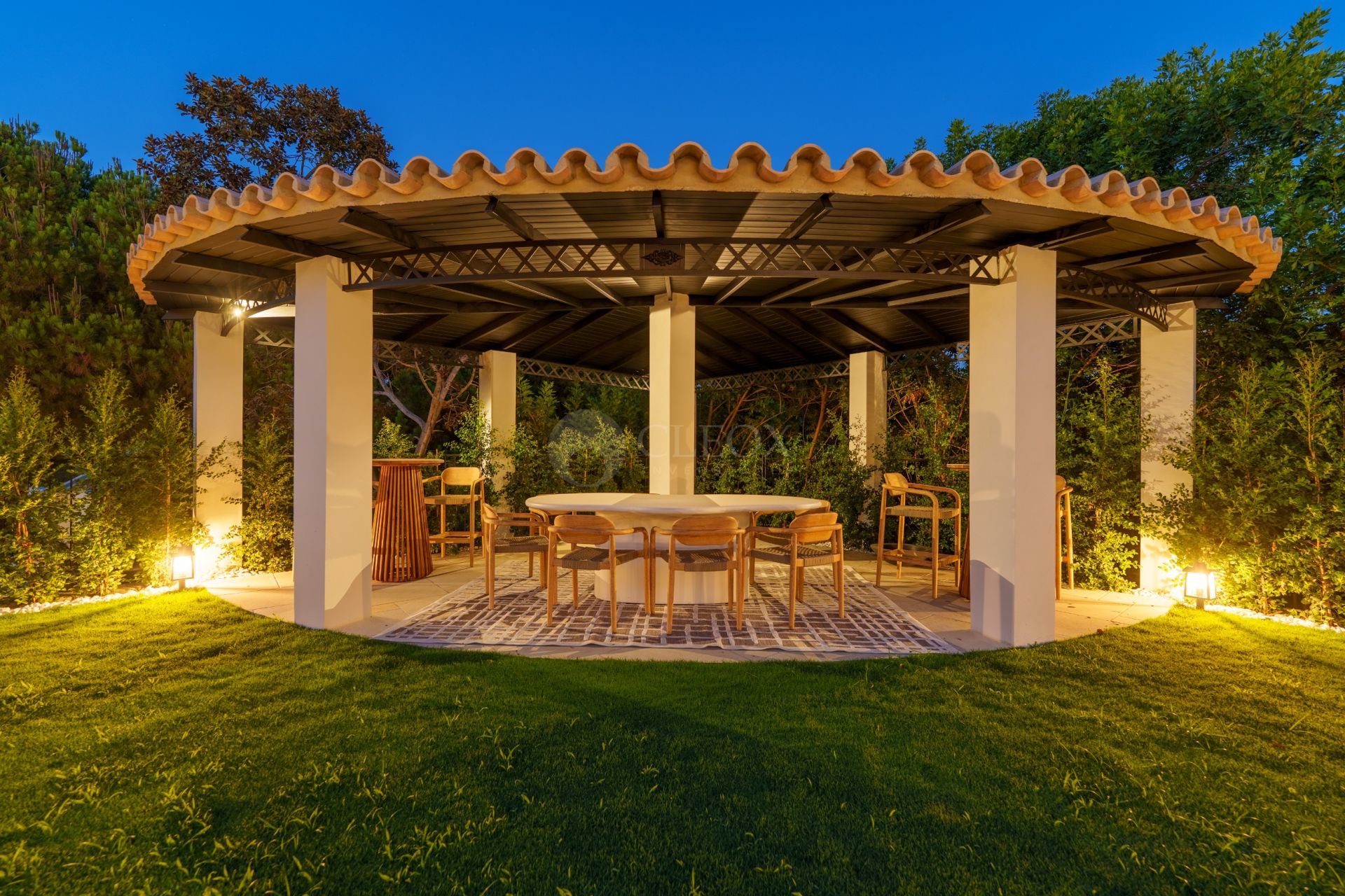 Outside, the landscaped gardens frame a private pool, a sunken lounge with ambient lighting, and multiple shaded areas for outdoor dining and relaxation. The panoramic views of the Mediterranean Sea and La Concha mountain create a truly exceptional setting to enjoy the Marbella lifestyle.