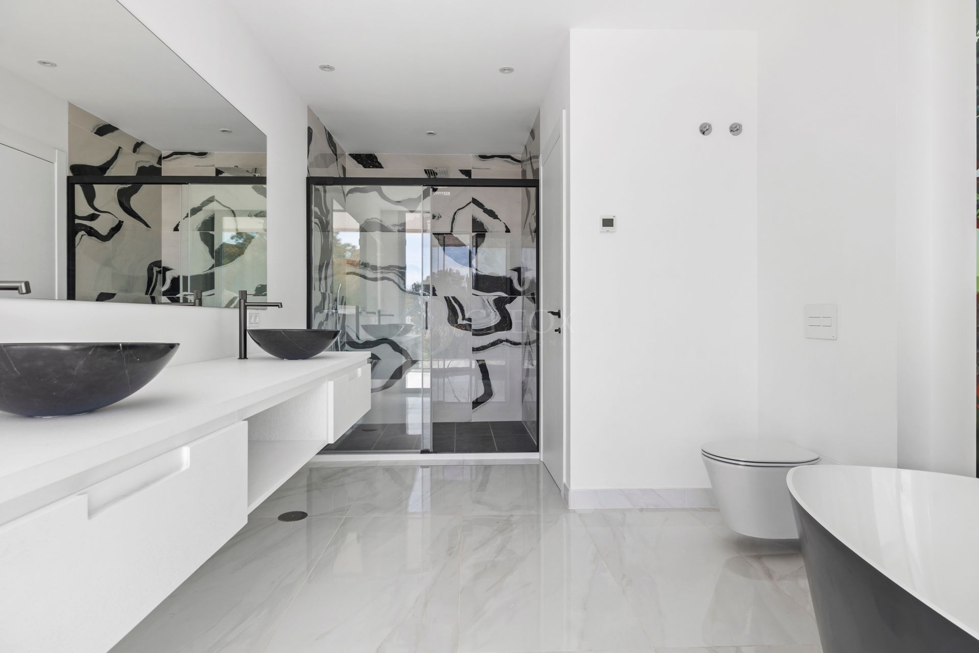 On the main floor, you’ll find a bright open-plan living and dining area with a fully equipped Bosch kitchen, a guest bedroom en suite, and a guest toilet. Large windows open onto spacious covered and open terraces, leading to the private swimming pool, perfect for enjoying the Costa del Sol sunshine all year round.