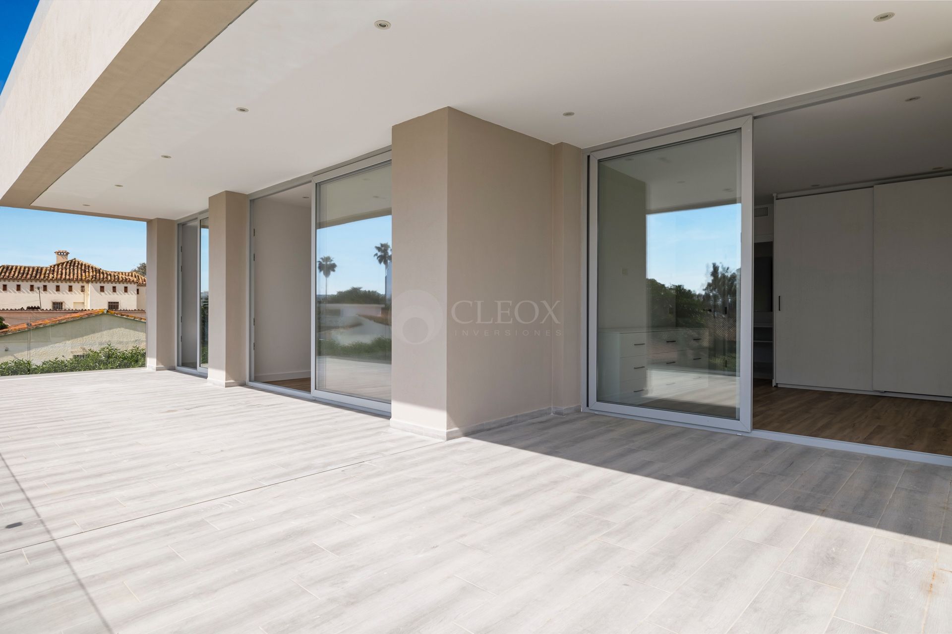 The first floor offers a stunning master suite with dressing area and private terrace, plus another guest bedroom en suite with terrace access. The rooftop solarium is the ideal place to relax, sunbathe, or enjoy beautiful sunsets.
