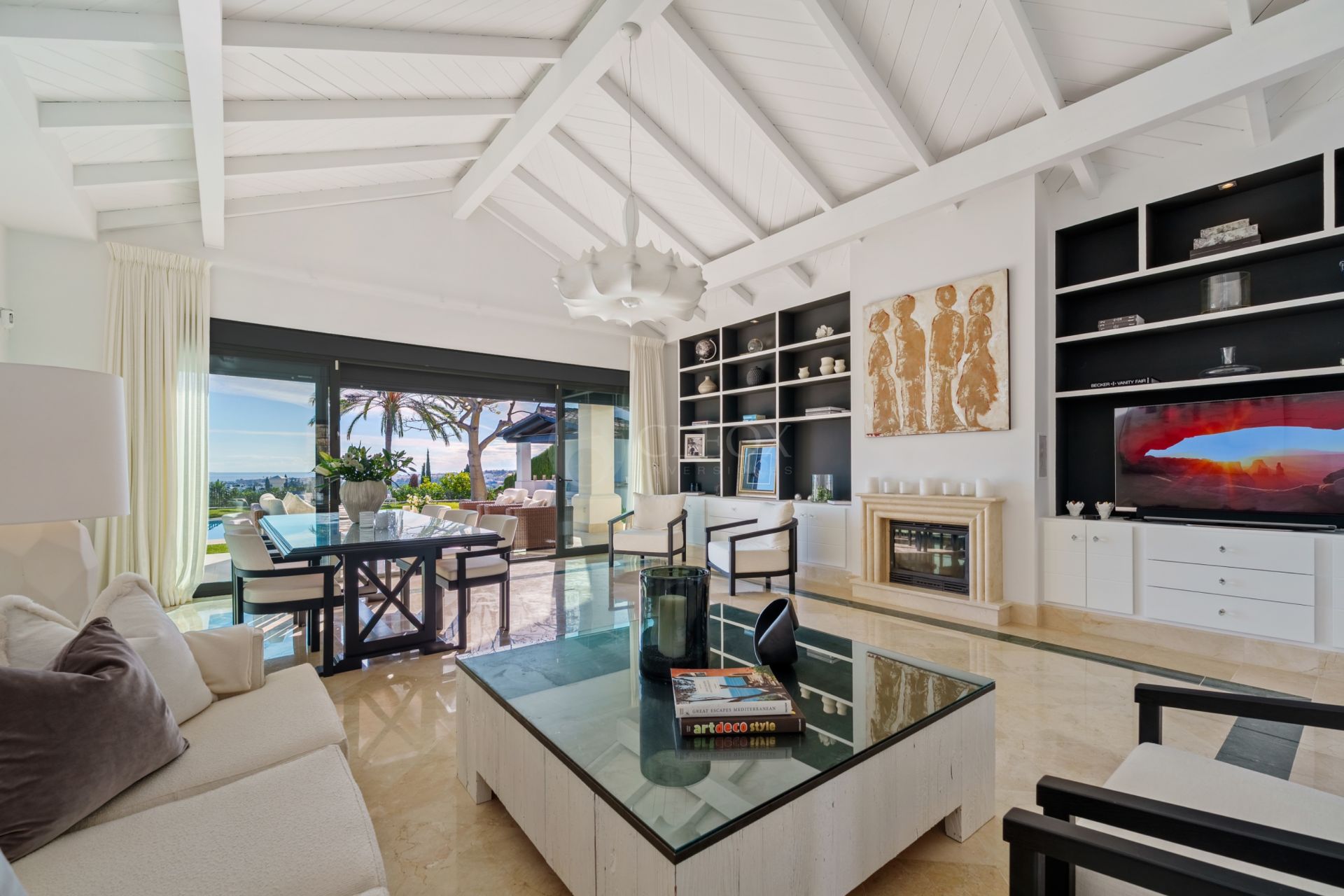 The main living and dining area is spacious and filled with natural light. High ceilings, marble flooring and full-height sliding doors create a seamless connection between the interior spaces and the outdoor terraces and garden. The design encourages indoor-outdoor living, allowing you to fully enjoy the Mediterranean lifestyle throughout the year.
