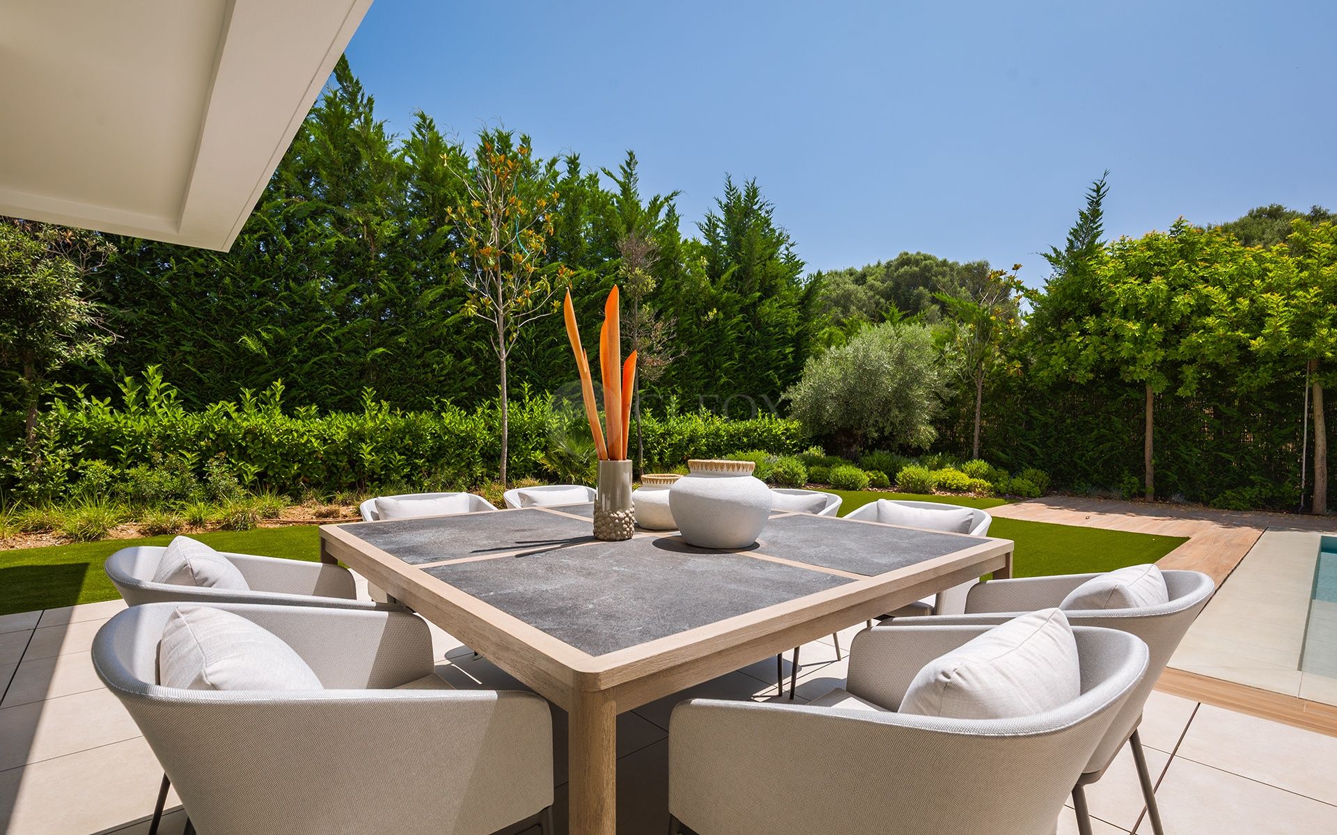 The outdoor areas are designed for effortless living: landscaped garden, private pool, and spaces created both for relaxation and entertaining in complete privacy. The property also includes covered parking for two vehicles and is delivered fully furnished, ready to move in.