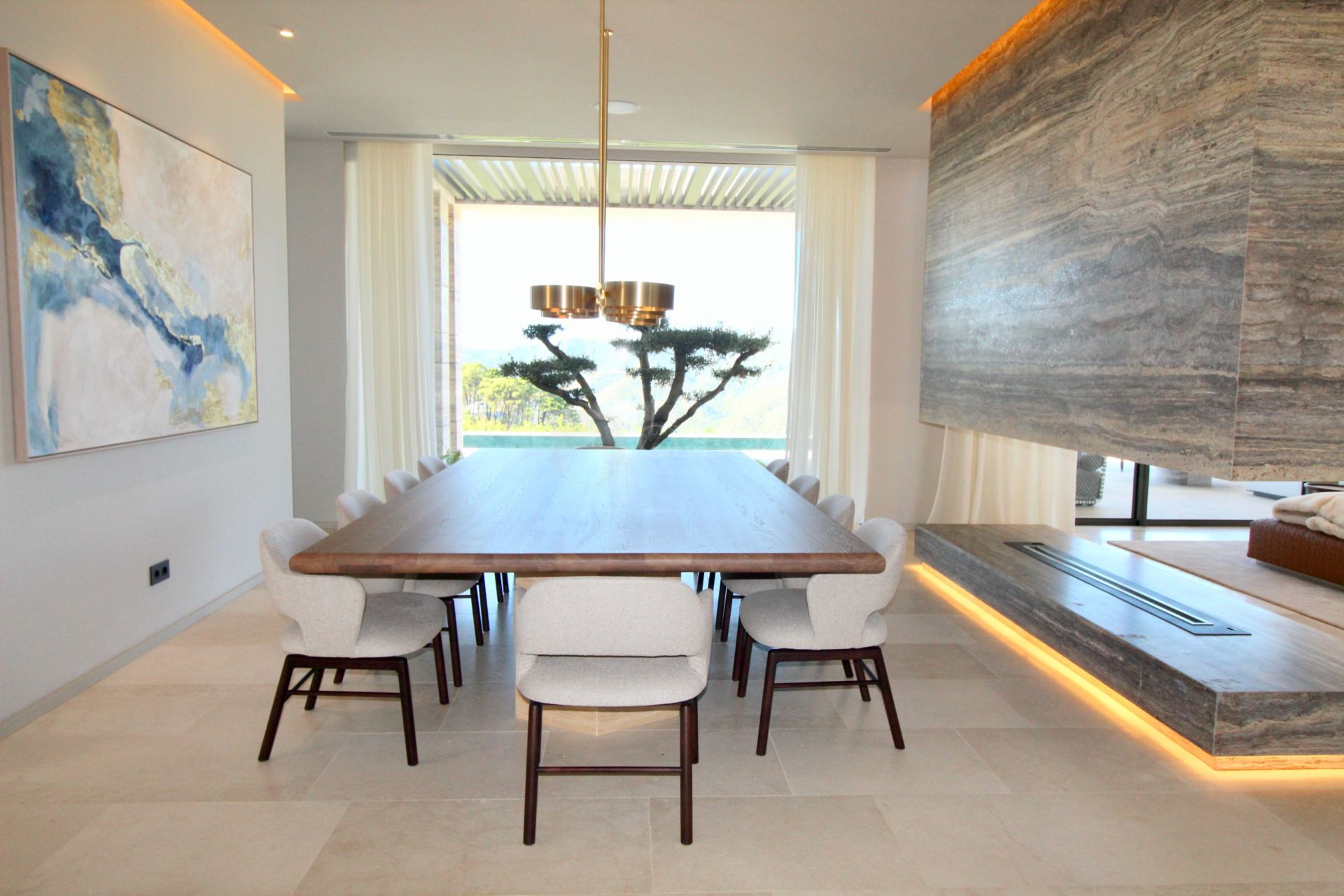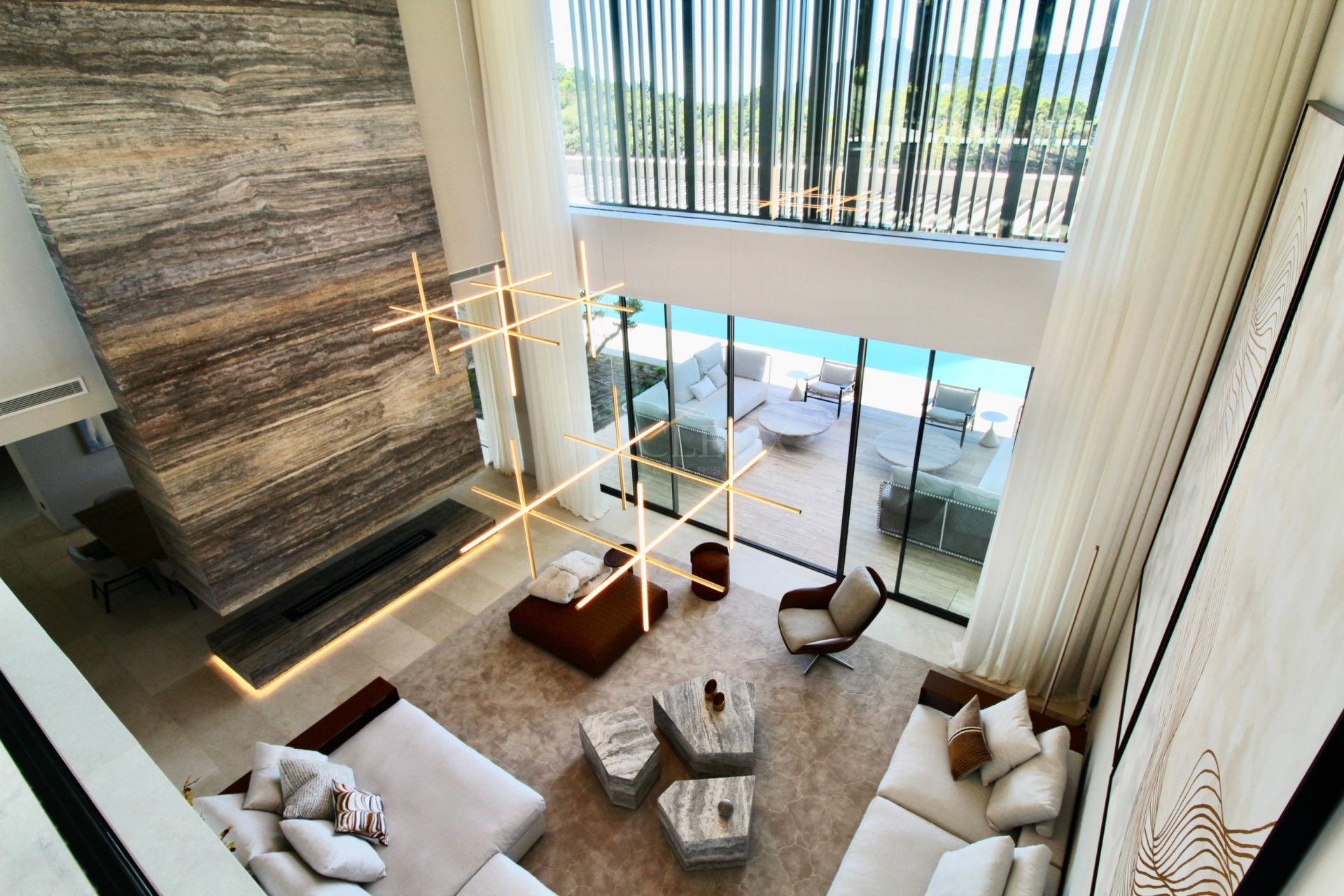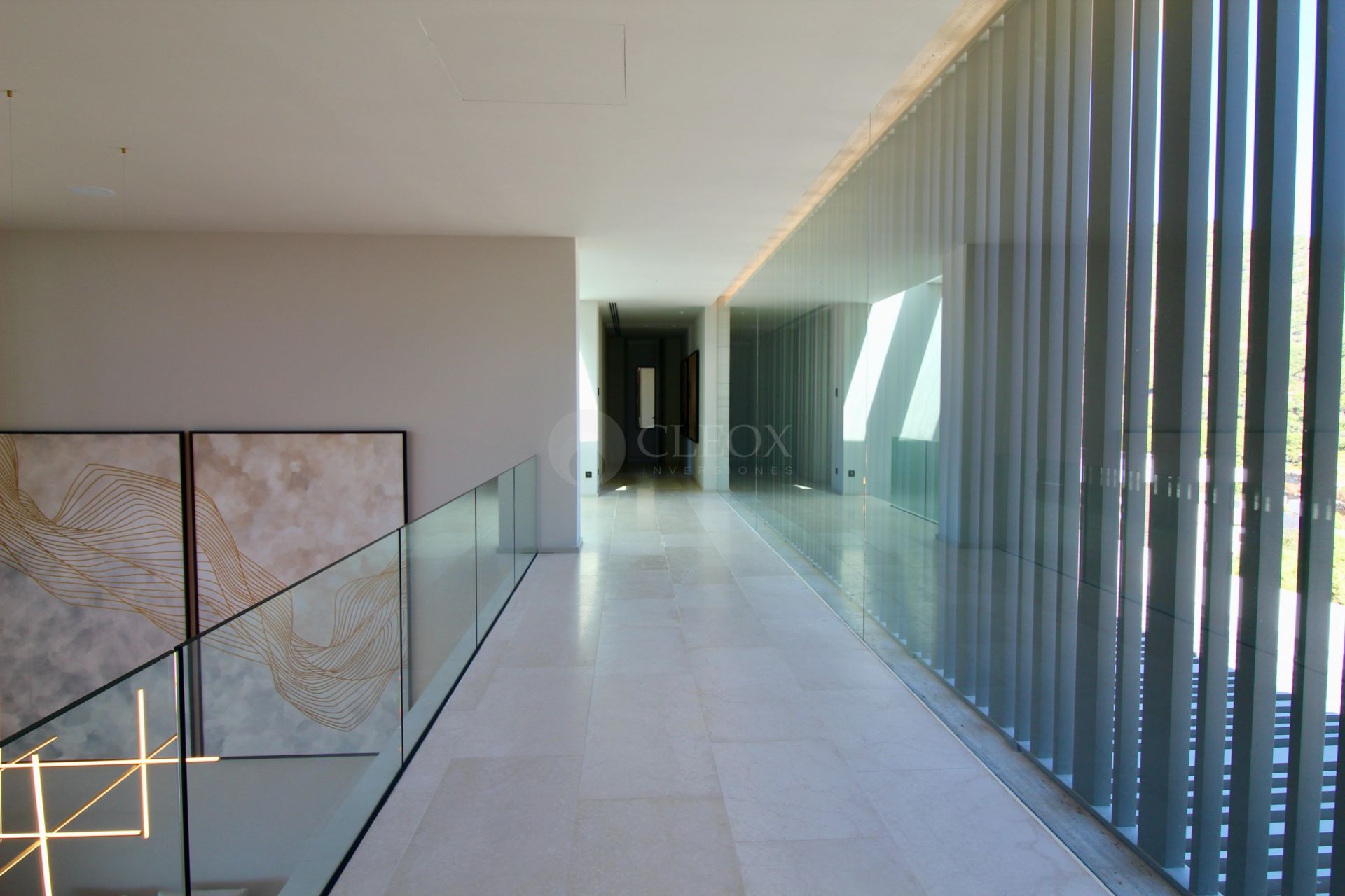 Construida sobre una parcela de 4.119 m² con orientación sur, la villa ofrece 2.010 m² construidos distribuidos en tres niveles conectados por ascensor. Desde el acceso principal, un hall de doble altura conduce a un salón con chimenea suspendida y ventanales de suelo a techo que se abren a las terrazas cubiertas, la piscina infinita y al paisaje natural que se extiende hasta el mar.