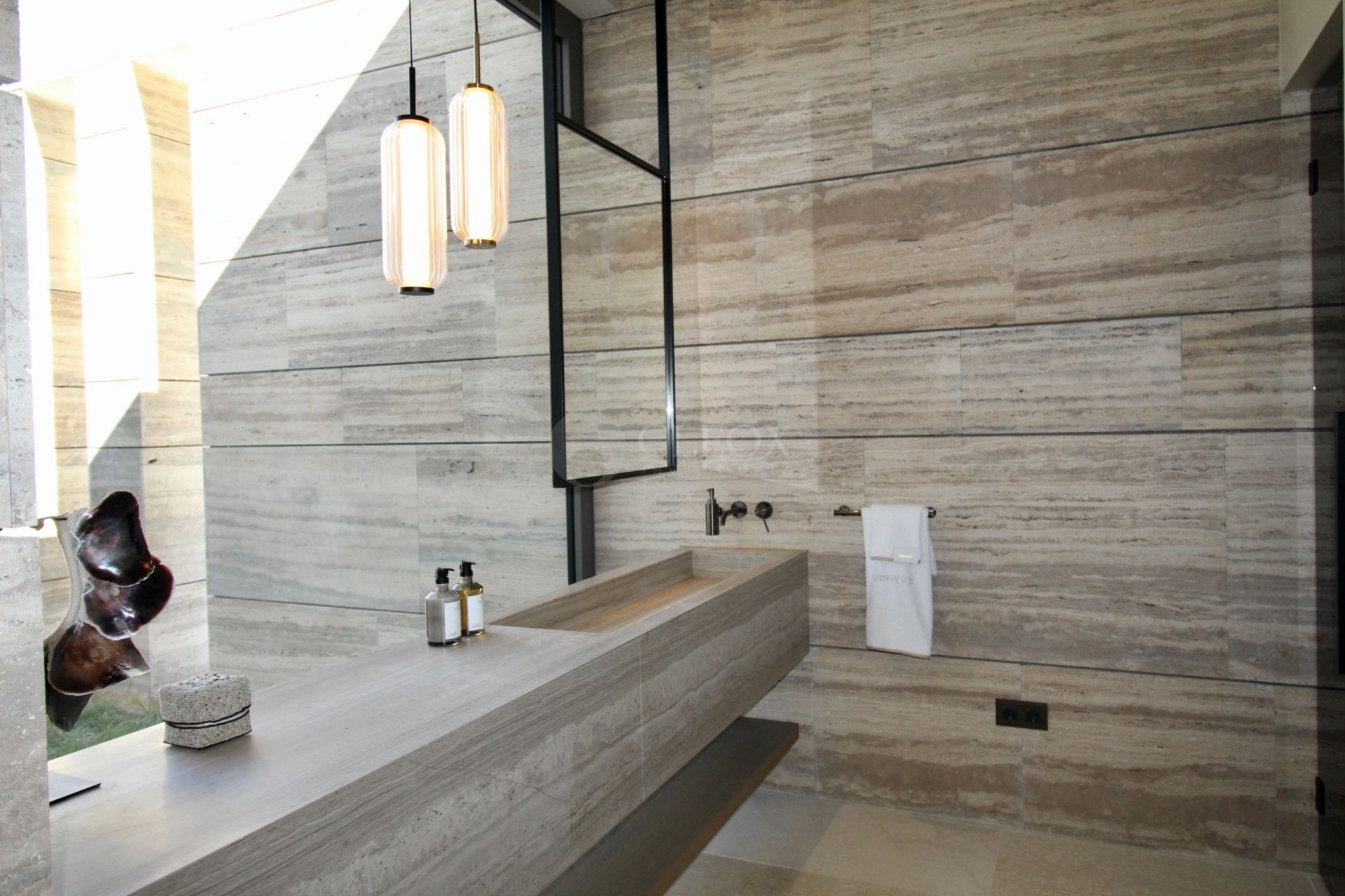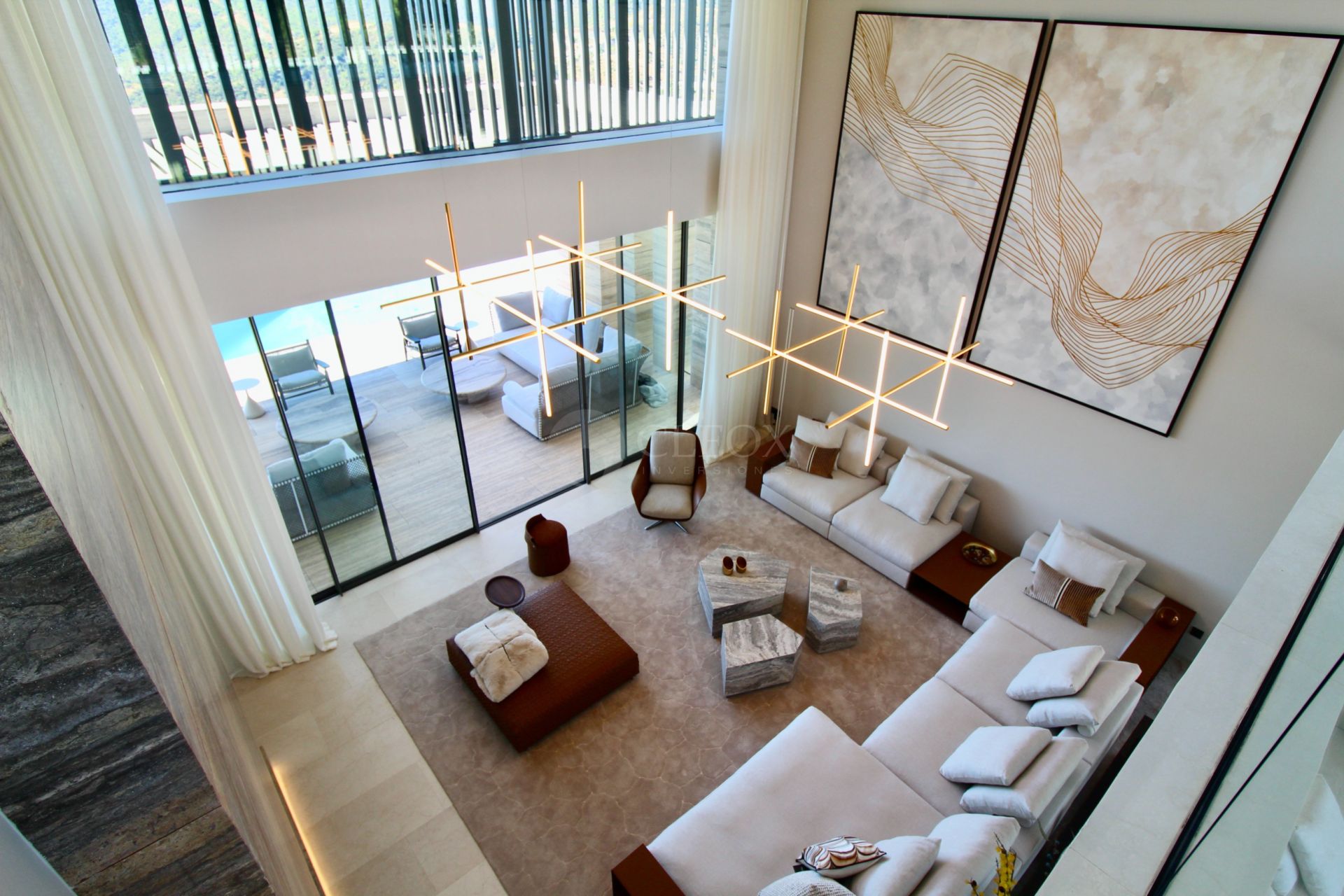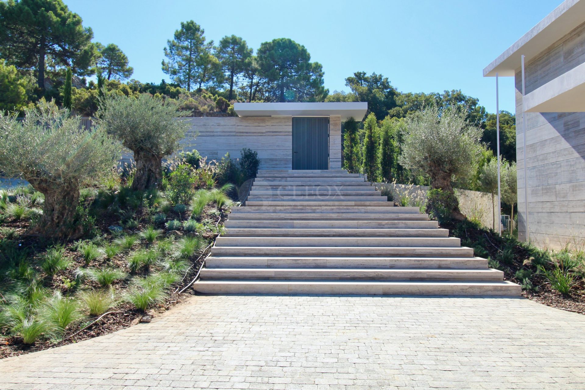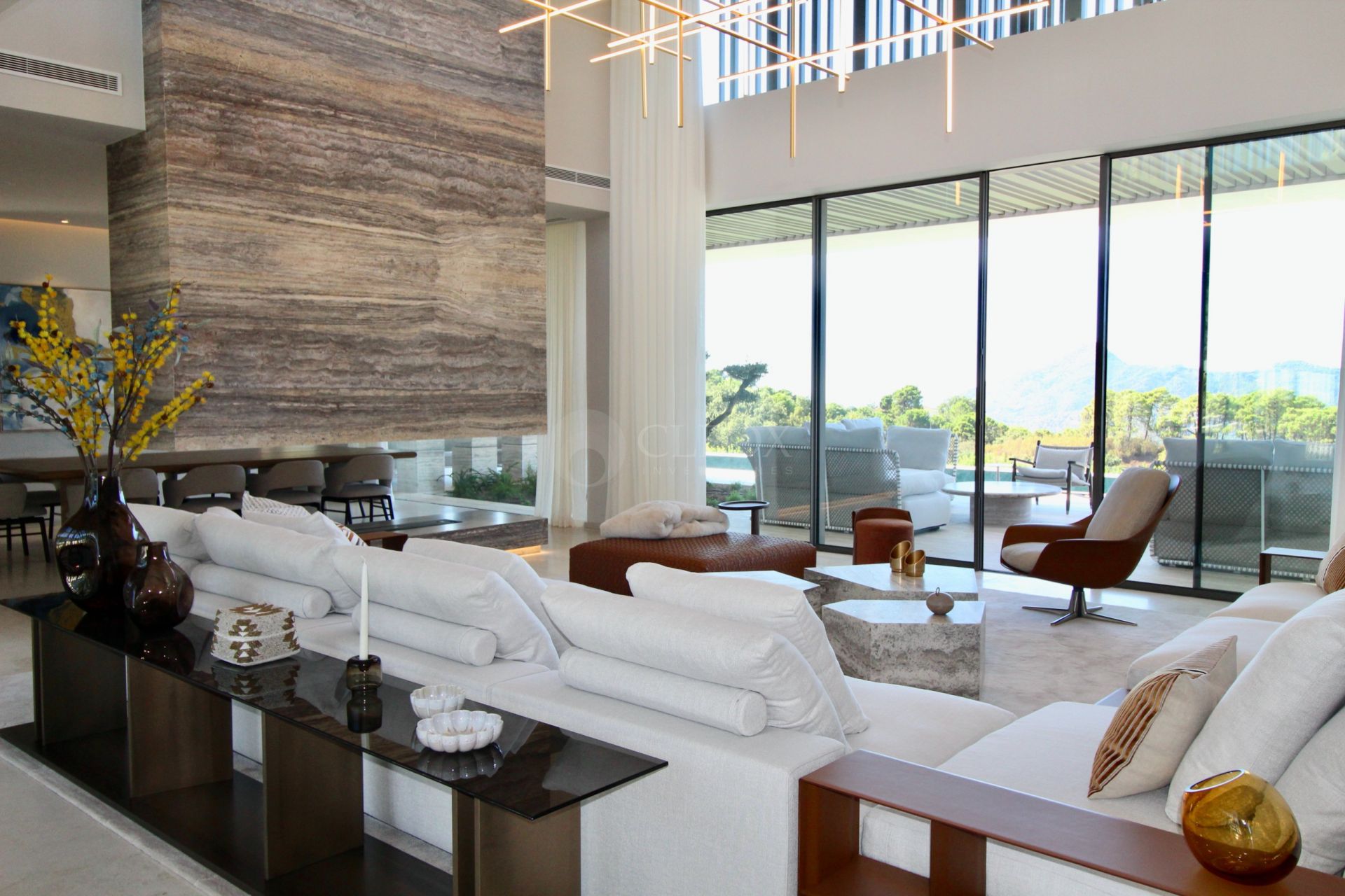 Construida sobre una parcela de 4.119 m² con orientación sur, la villa ofrece 2.010 m² construidos distribuidos en tres niveles conectados por ascensor. Desde el acceso principal, un hall de doble altura conduce a un salón con chimenea suspendida y ventanales de suelo a techo que se abren a las terrazas cubiertas, la piscina infinita y al paisaje natural que se extiende hasta el mar.