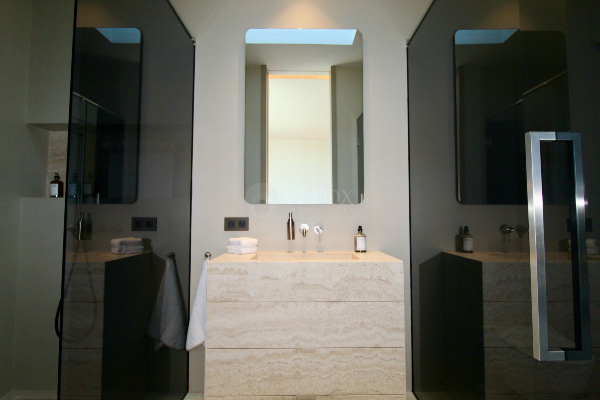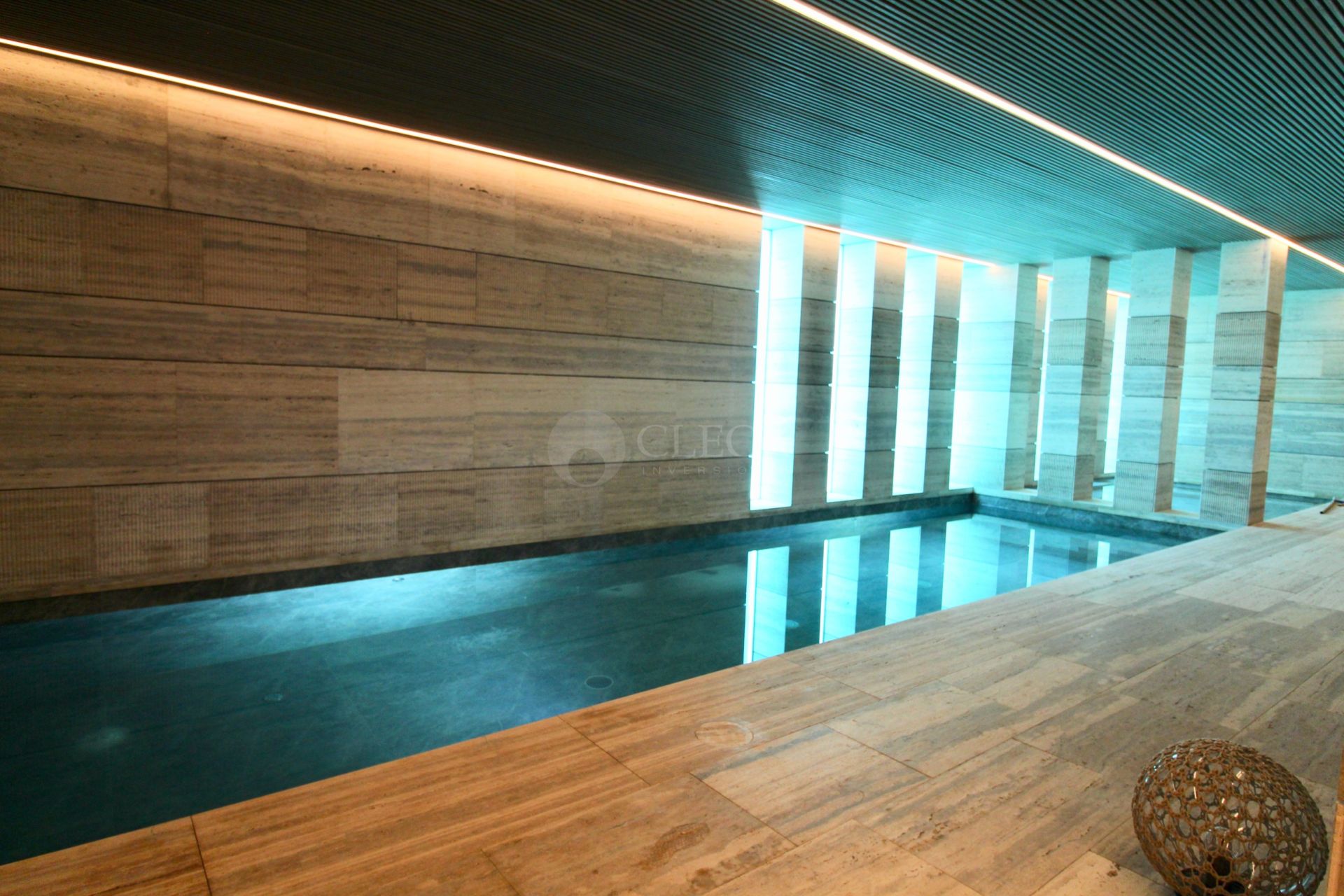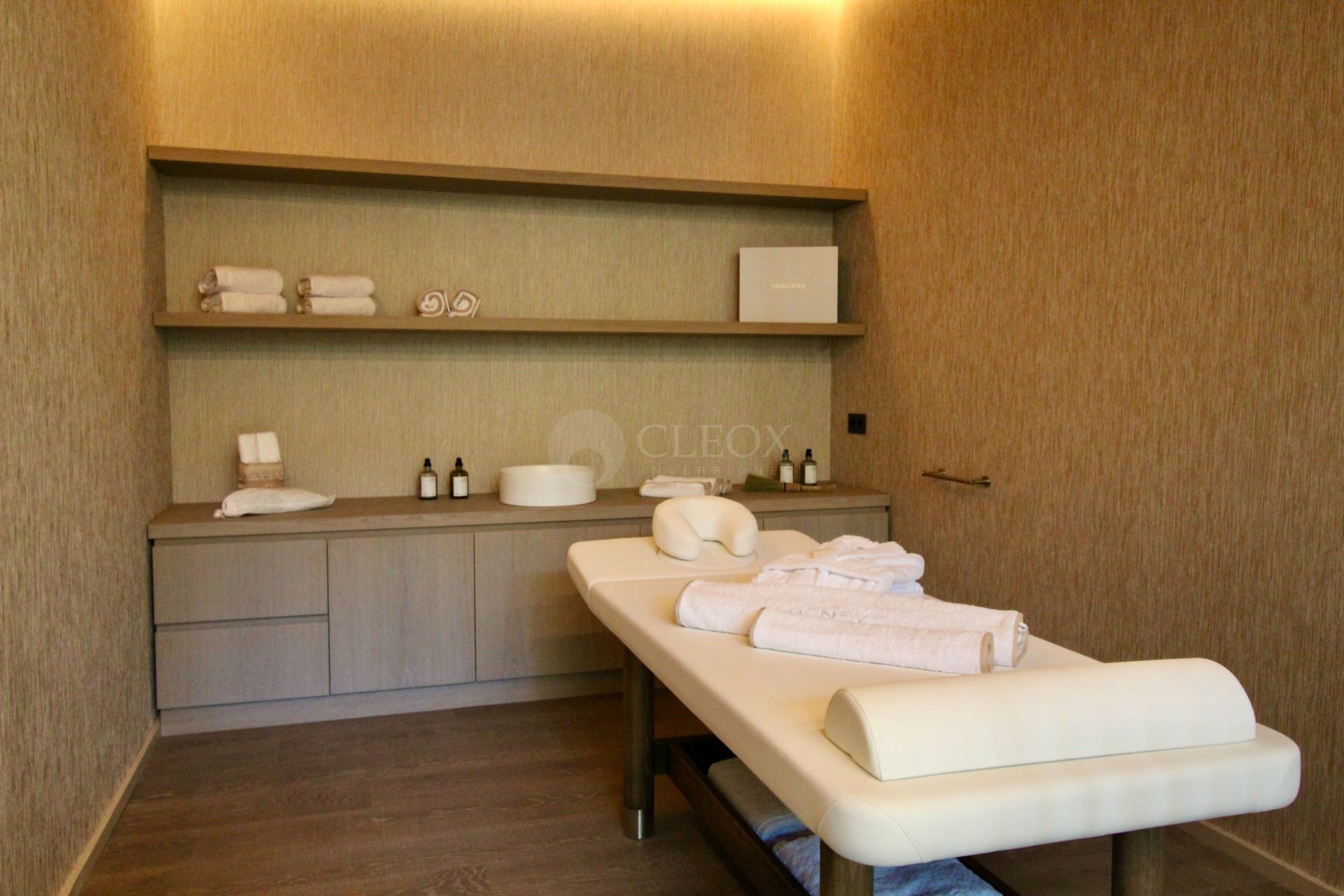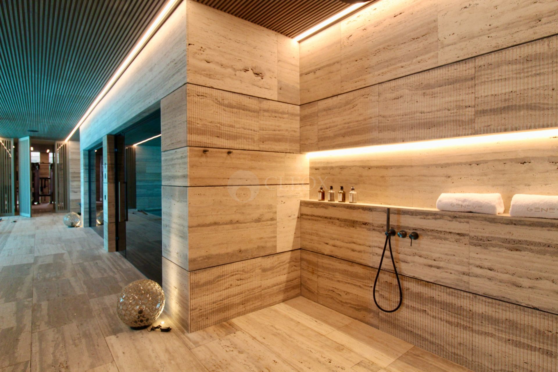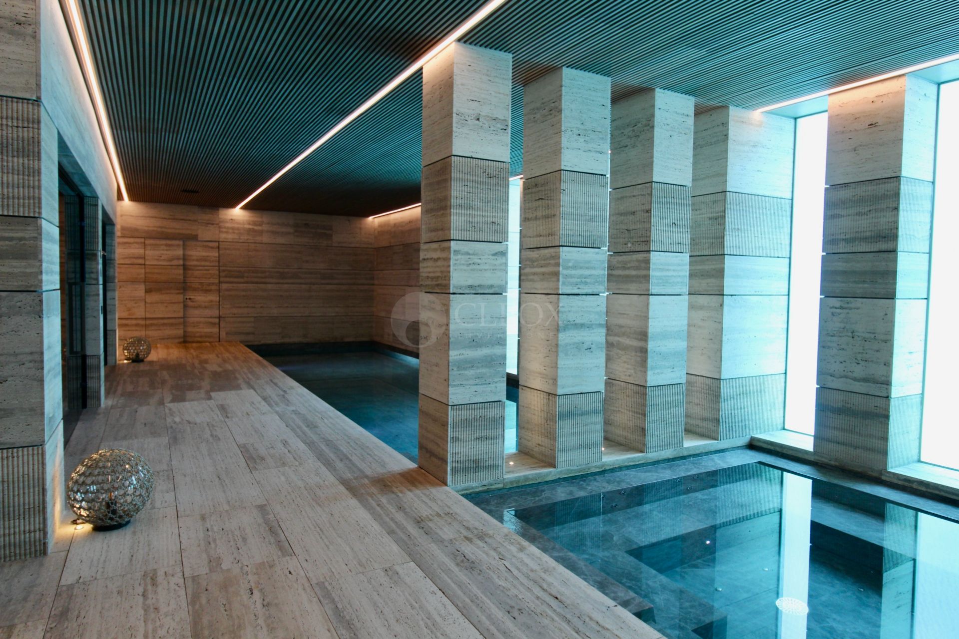 La planta inferior está dedicada al bienestar: piscina interior climatizada, jacuzzi, sauna, baño turco, sala de yoga, masajes y bodega profesional. Además, hay dos dormitorios con jardín, un apartamento independiente para invitados o personal, lavandería y un garaje para ocho coches. En la entrada de la villa hay una pérgola con espacio para aparcar cómodamente 3 coches.