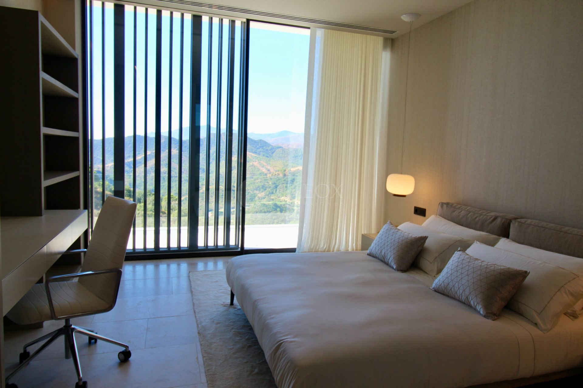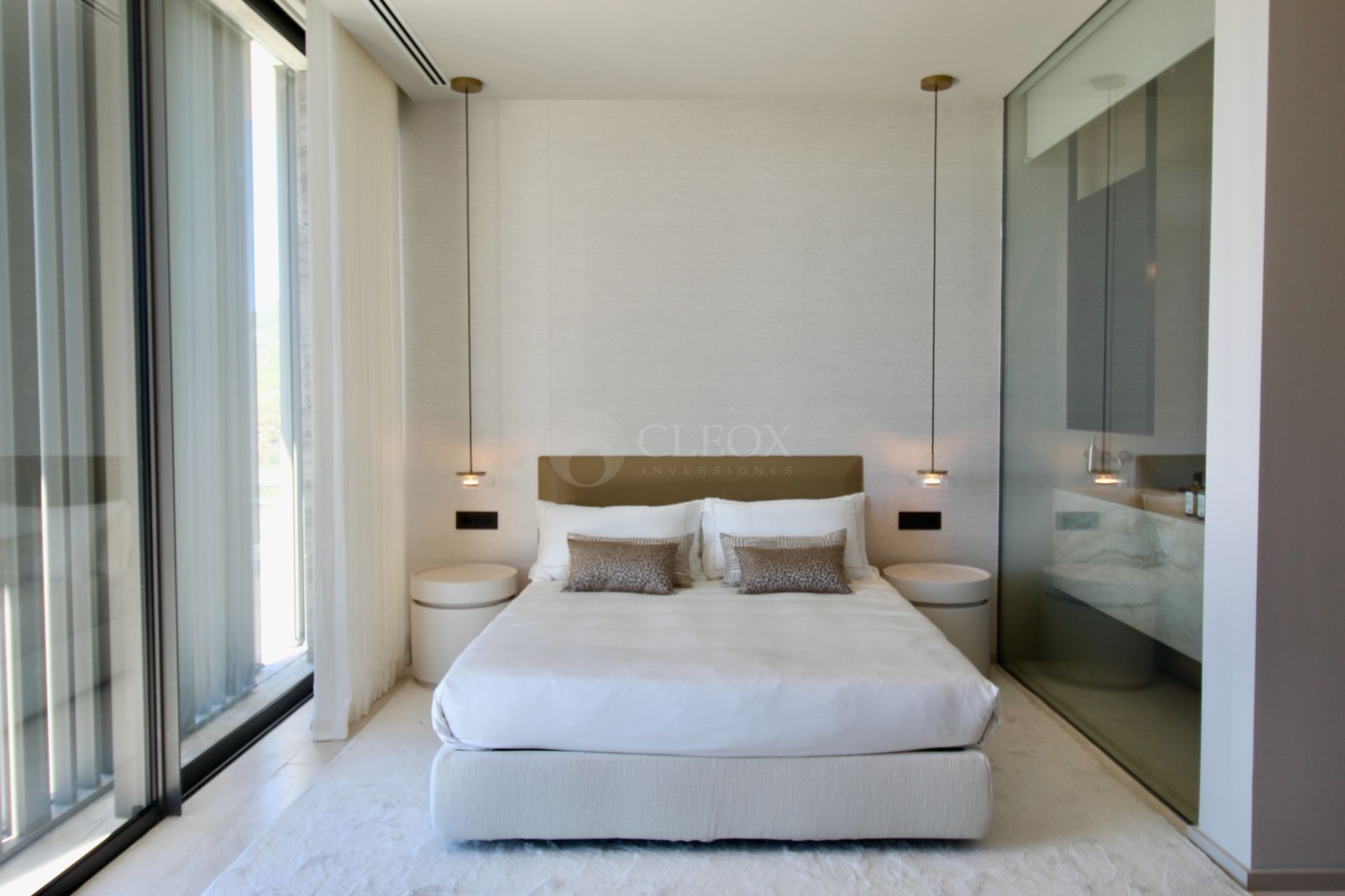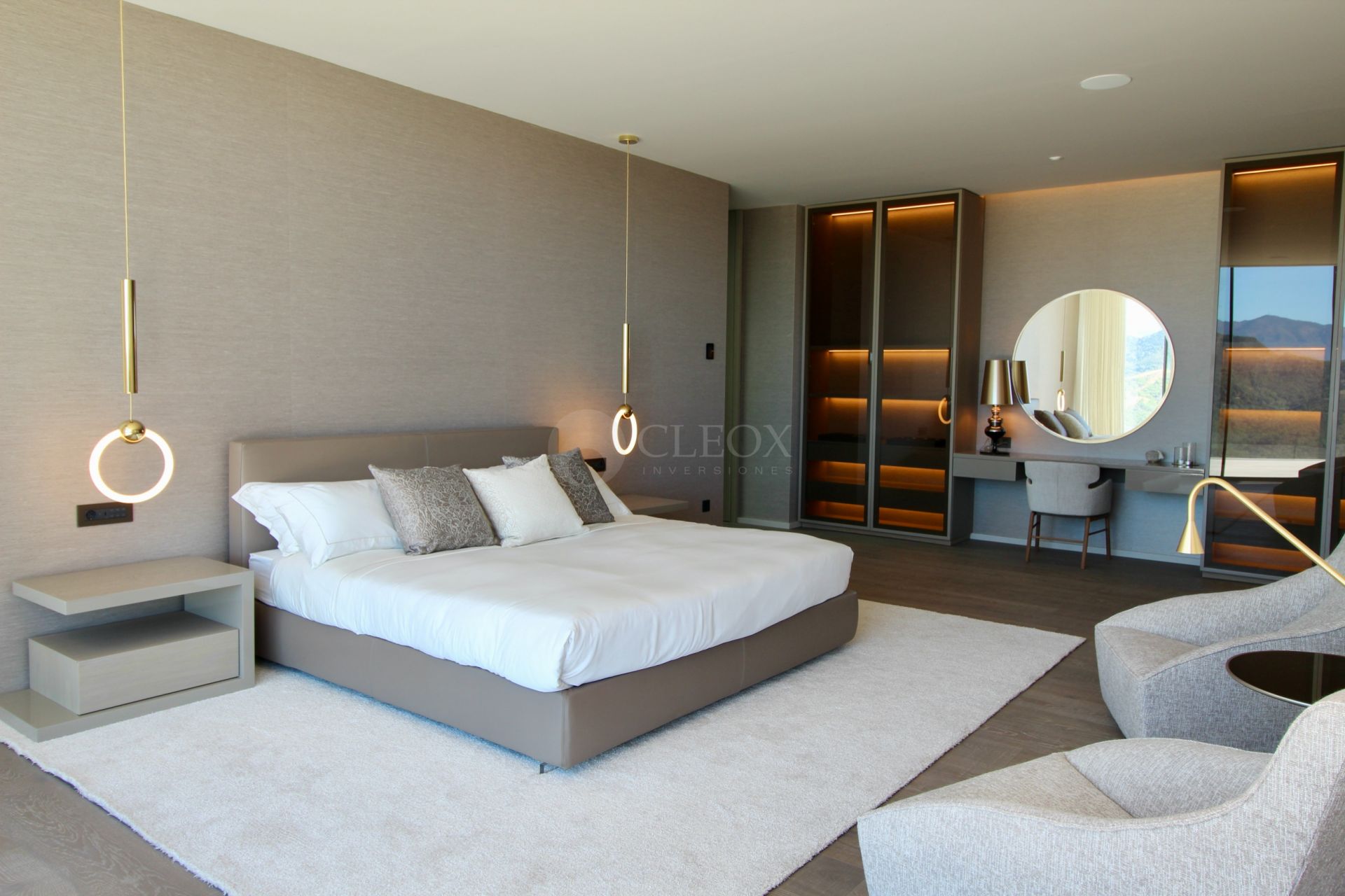 En la planta superior, el dormitorio principal cuenta con vestidor, baño tipo spa y terraza con vistas al mar y la montaña. Dos suites adicionales completan este nivel, cada una con su propia terraza.