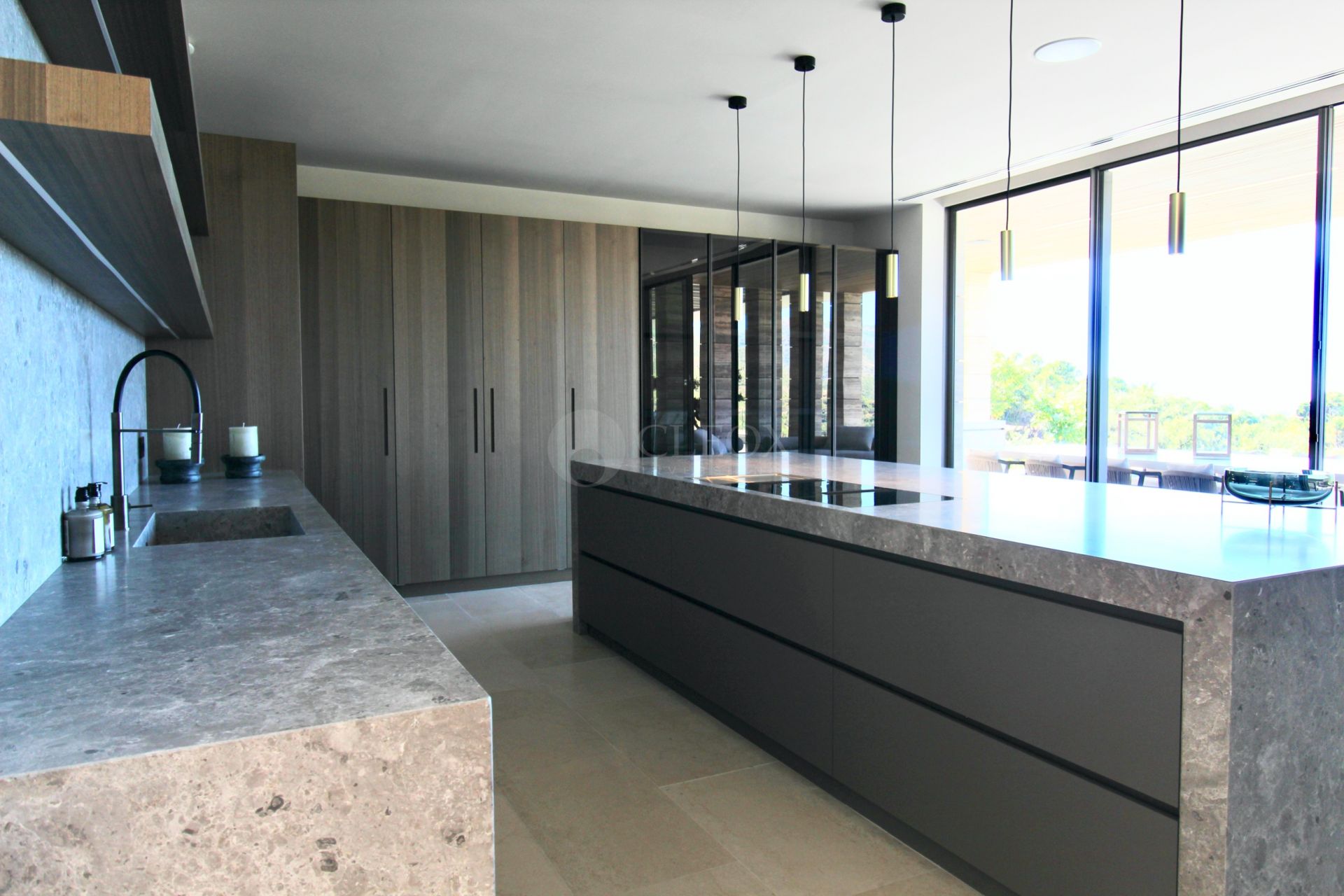 La cocina, de diseño contemporáneo, se divide en zona principal y cocina de trabajo independiente, ambas conectadas con el comedor interior y exterior. En la planta principal también se encuentra un despacho privado, aseo de cortesía y una suite para invitados con salida a terraza.
