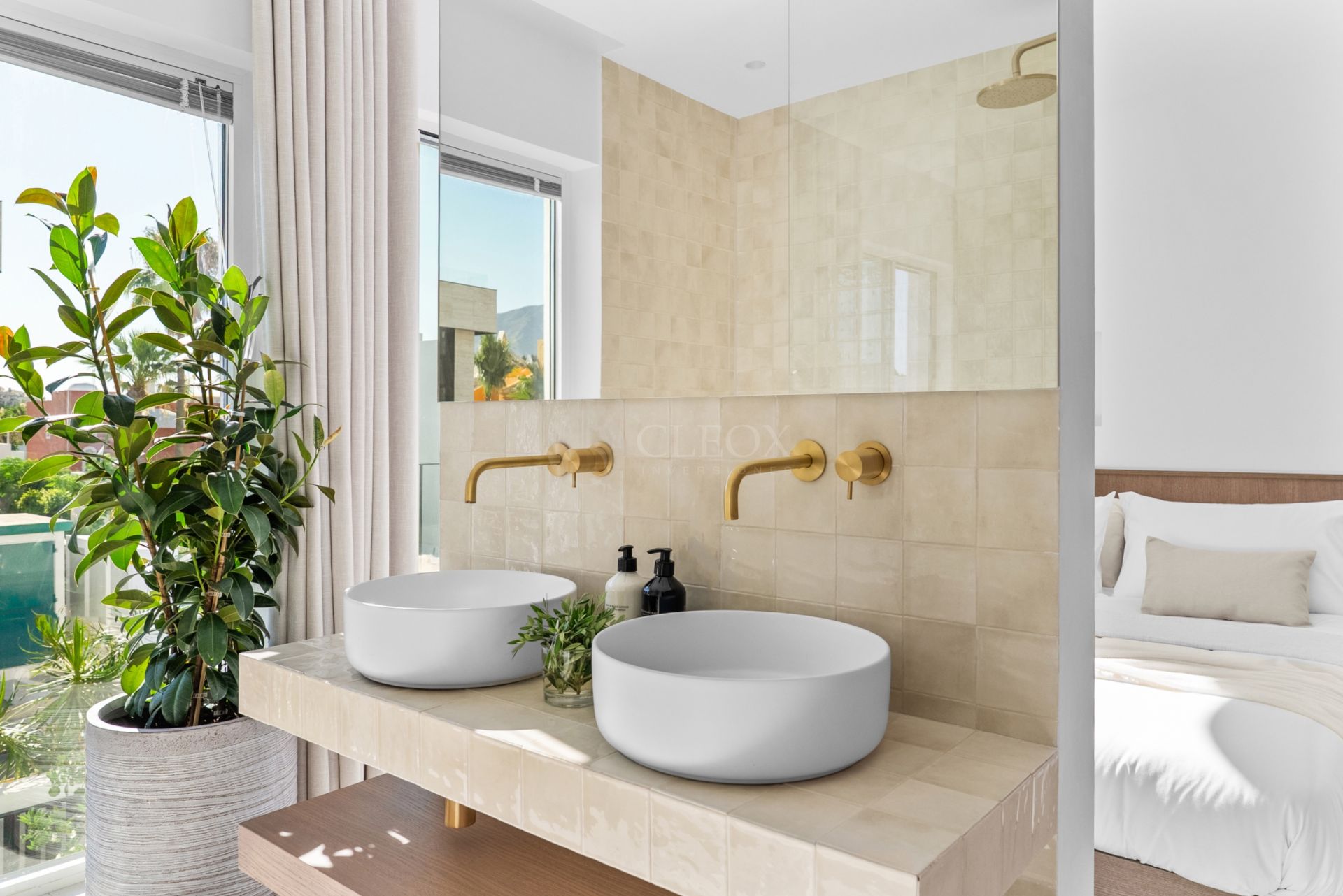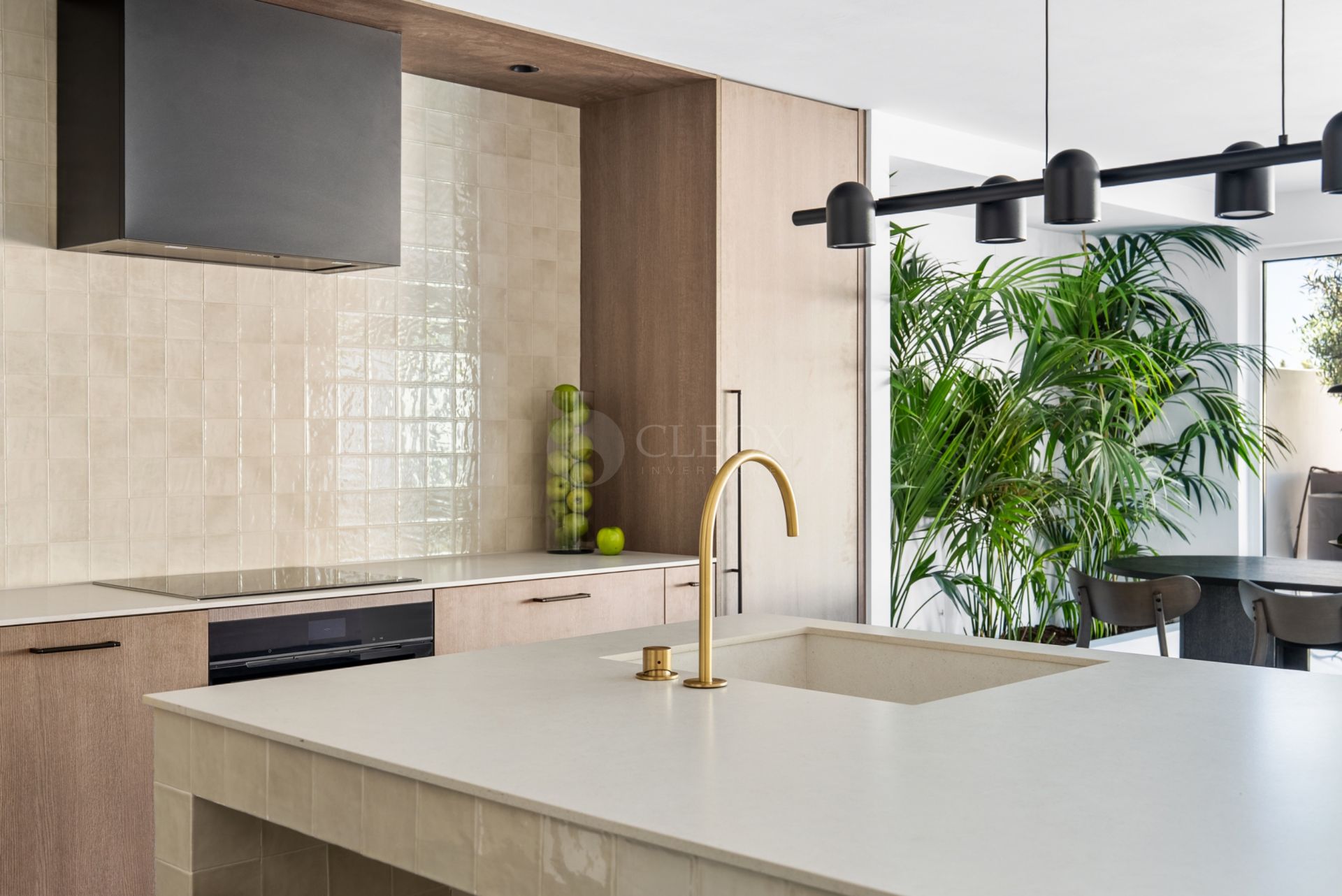 Esta vivienda moderna en venta en Marbella ha sido diseñada para compradores internacionales que desean una segunda residencia donde disfrutar del clima el estilo de vida mediterráneo y la tranquilidad sin renunciar a la cercanía de los mejores servicios La propiedad integra tonos tierra madera de roble ahumado acabados en negro mate detalles en oro y auténticos azulejos zellige creando un ambiente elegante cálido y atemporal