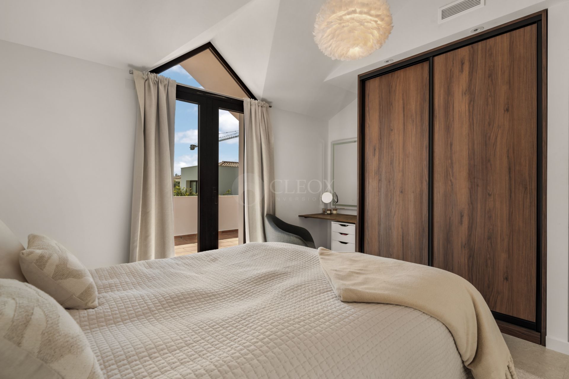 La planta superior alberga la zona de descanso, con una refinada suite principal que destaca por sus techos altos, armarios empotrados y baño en suite, además de acceso a una terraza privada. Un segundo dormitorio en suite cuenta también con su propia terraza orientada al suroeste, ideal para disfrutar de largas tardes de sol y vistas al atardecer.