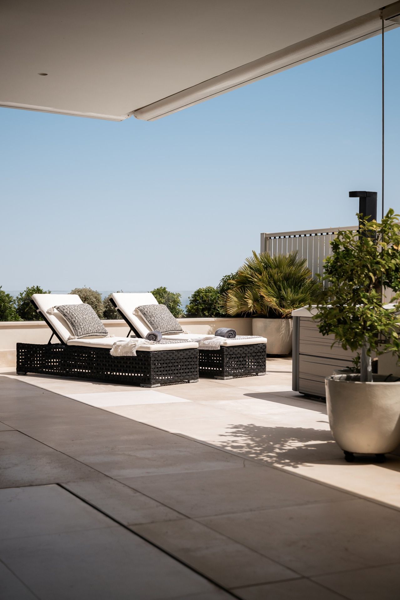 La amplia terraza en forma de L ofrece espectaculares vistas panorámicas al mar, zona chill out, comedor exterior, jacuzzi, ducha exterior y cocina de verano rodeada de jardines privados.