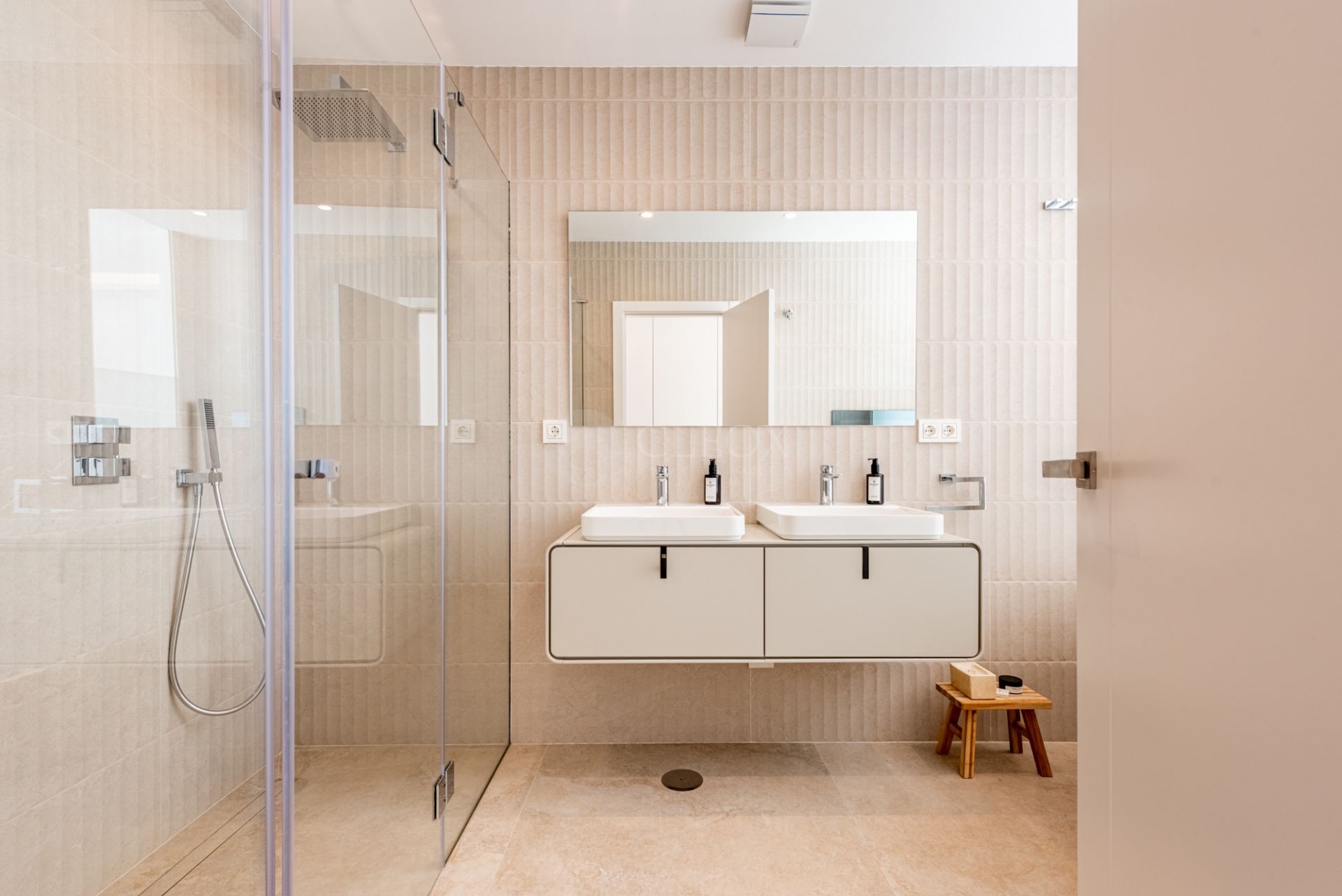 На основном этаже расположена светлая гостиная открытой планировки, объединённая с современной кухней, полностью оснащённой техникой Miele премиум-класса. Панорамные раздвижные двери ведут на просторную террасу с летней кухней и зоной отдыха, идеально подходящую для приёма гостей и наслаждения средиземноморским климатом. Здесь также находится гостевая спальня и ванная комната.