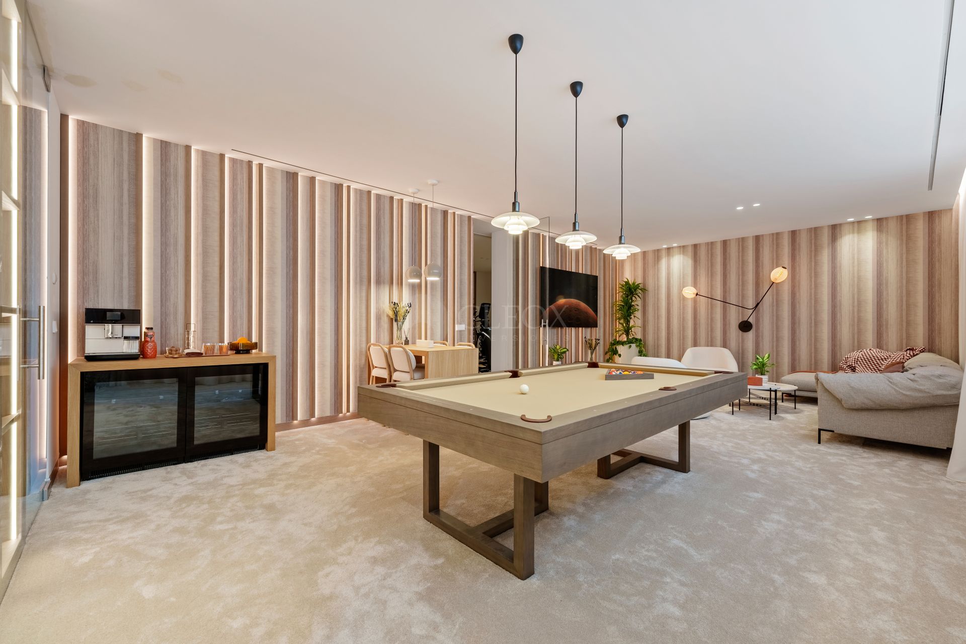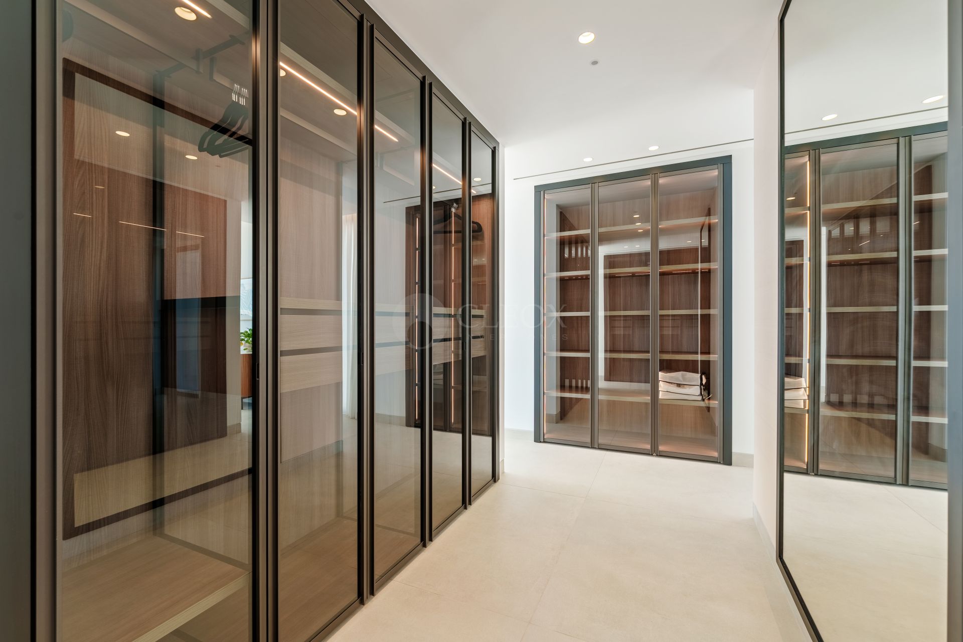 Недвижимость распределена на трёх просторных уровнях и включает пять спален и пять ванных комнат, выполненных с использованием высококачественных материалов и современного дизайна. На основном уровне расположены светлые открытые пространства: гостиная, изысканная столовая и полностью оборудованная дизайнерская кухня. Из этих зон есть прямой выход на просторные террасы и к впечатляющему инфинити-бассейну площадью 51 м², создающему идеальное пространство для жизни внутри и снаружи дома.