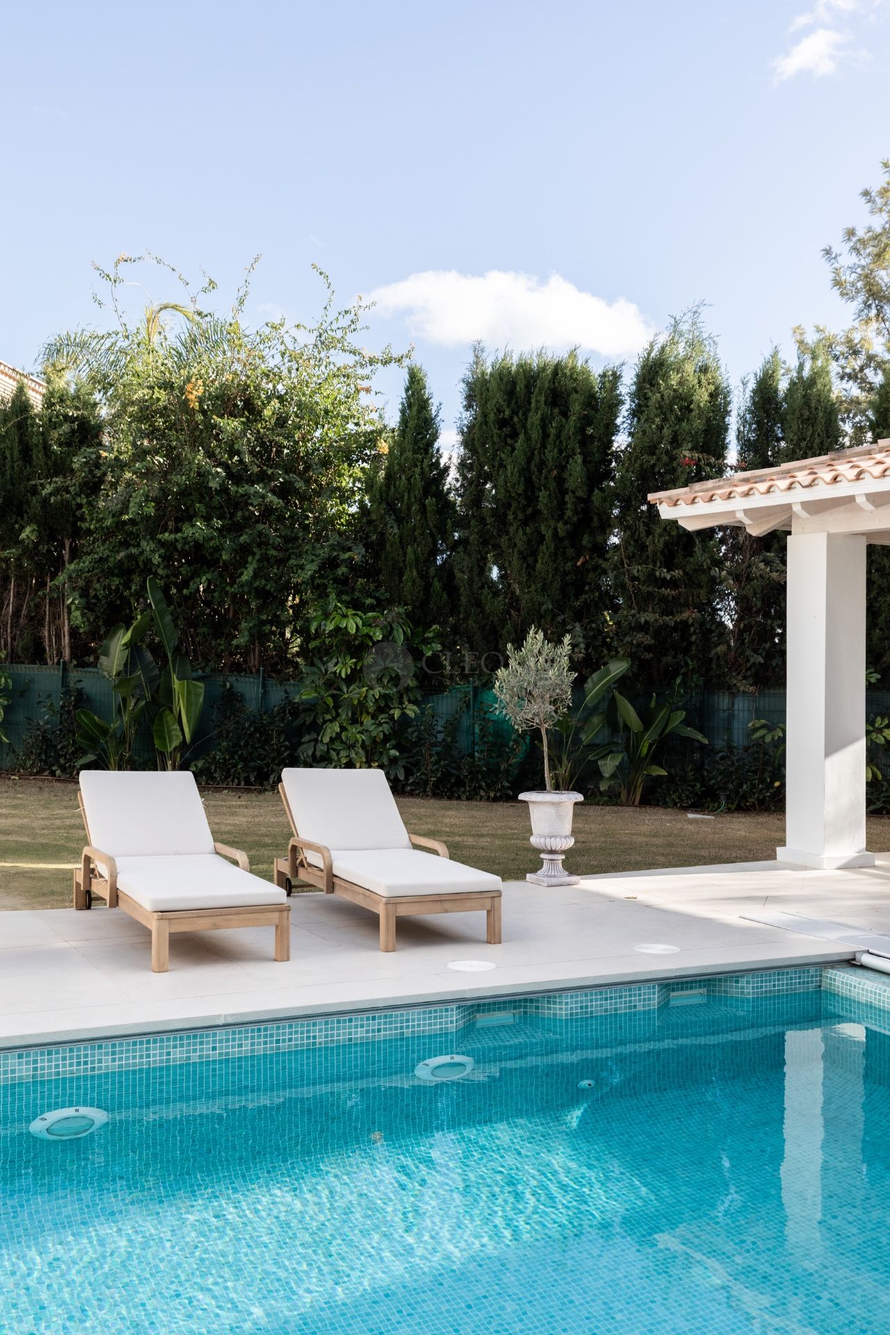 Спальни спроектированы как уютные и приватные зоны отдыха, оформленные в спокойных нейтральных тонах, создающих атмосферу комфорта и уюта. Внешнее пространство виллы включает ухоженные сады, солнечную зону у бассейна и несколько лаунж-зон, идеально подходящих для отдыха и общения.