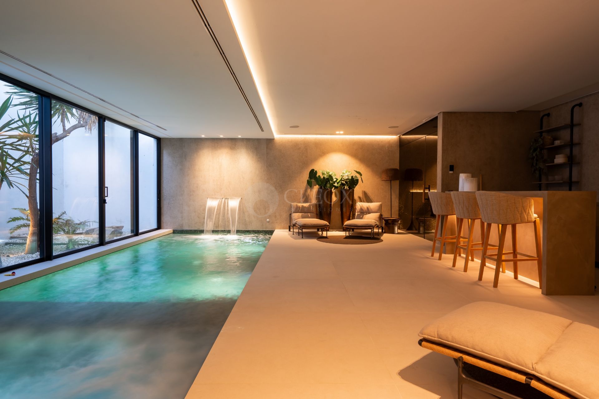 Нижний уровень переосмысливает концепцию wellness: крытый подогреваемый бассейн, сауна, хаммам, тренажёрный зал, бар, гостевые спальни и отдельные апартаменты. Всё интегрировано. Ничего не оставлено на случай.